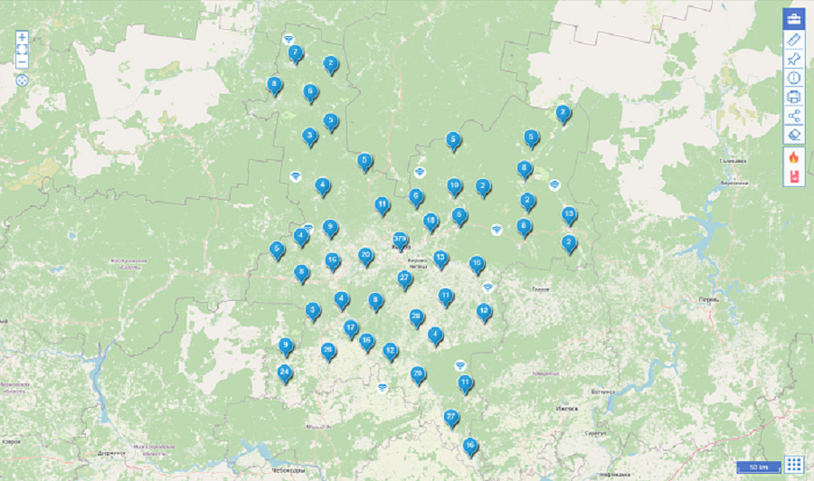 На карте указаны более 900 точек Wi-Fi-доступа, расположенных по всей территории области, из которых более 350 находятся в городе Кирове.