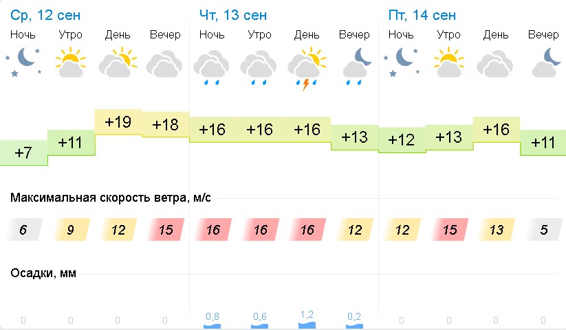 Днем температура прогреется до +19. Завтра будет +16, ожидаются дожди, грозы и сильный ветер — 15-16 м/с.